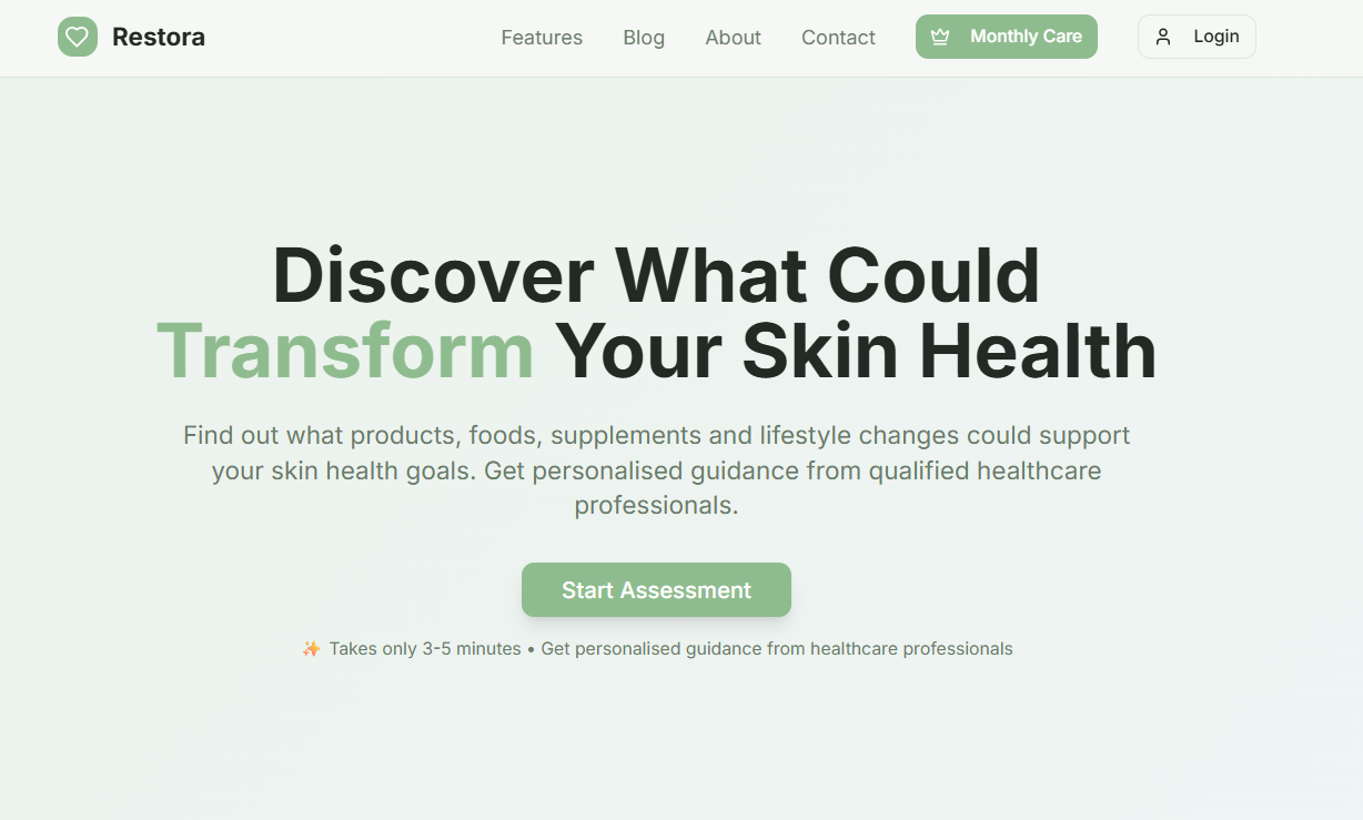 Our main website is coming soon, please use our Restora app for the most comprehensive skin & health assessment, for free. Let us know what you'd like to be added to these services.